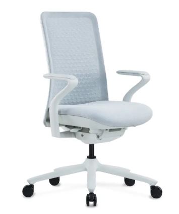 Synchroon mechaniek met gewichtsregeling. Mesh rugleuning voorzien van een verstelbaar lendensteun. Zitting gestoffeerd en voorzien van zitdiepte instelling. Kleur: grijs. Armleggers in hoogte verstelbaar. Kunststof onderstel kleur wit met wielen voor harde vloeren.